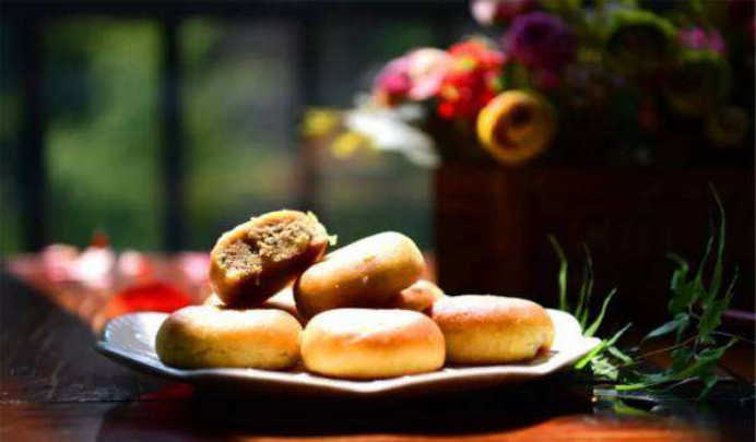由糖、芝麻,金桔花、茴香,拌上桂子油作餡,再放些胡椒,外在裹上面皮,成餅狀烘烤而出。